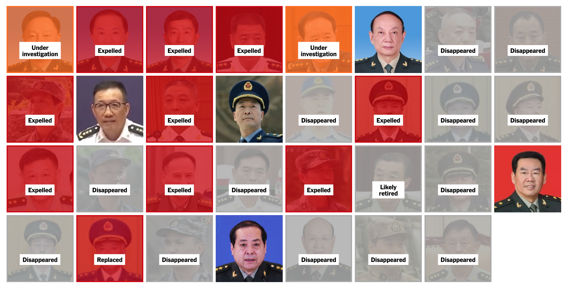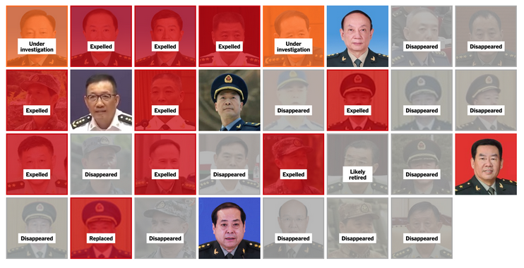 Desde comienzos de 2023, de treinta generales y almirantes de alto rango, solo siete han conservado sus cargos; el resto ha sido retirado o ha “desaparecido” de facto del ámbito público, según cálculos de The New York Times basados en informes de medios estatales chinos y declaraciones oficiales. El último episodio fue la apertura de casos contra el principal subordinado de Xi Jinping en la Comisión Militar Central, Zhang Youxia, y el jefe del Estado Mayor Conjunto de la comisión, el general Liu Zhenli, sospechosos oficialmente de “graves violaciones de la disciplina y la ley”.